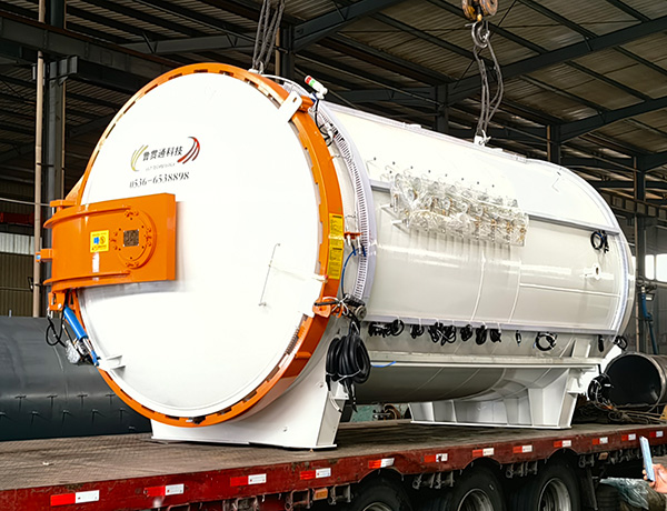 其核心工作流程围绕“真空排杂-均匀温控-加压固化”展开:先将碳纤维、玻璃纤维等预浸料按设计铺层于模具,搭配脱模布、透气层等辅助材料后密封进真空袋,抽真空排除层间空气与挥发分,为后续固化奠定基础。送入罐内后,特制循环风机带动气流经环形风道强制循环,配合均匀分布的加热元件,使热空气全面覆盖真空袋系统,确保罐内温度均匀分布,避免局部过热或欠热。同时通入气体加压,利用袋内外压差实现均匀施压,推动树脂充分浸润纤维并排出残余气泡,大幅降低构件孔隙率。经恒温保压完成固化后,缓慢降温以减少内应力,最终获得尺寸稳定、性能均一的制品。